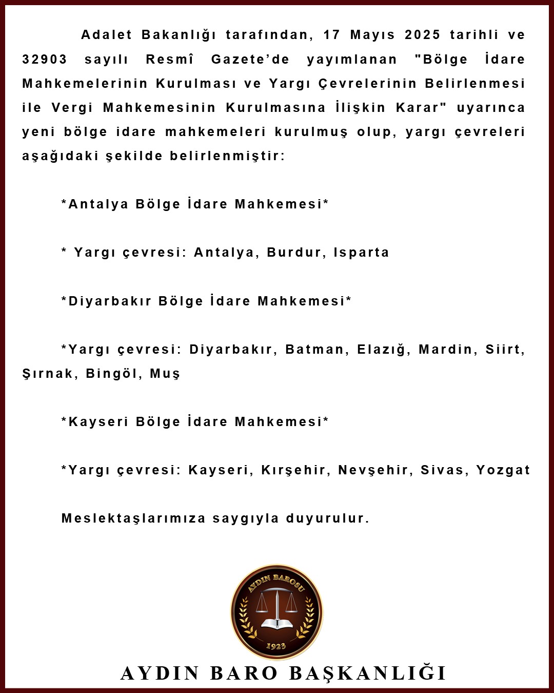 Adalet Bakanlığı tarafından, 17 Mayıs 2025 tarihli ve 32903 sayılı Resmî Gazete’de yayımlanan "Bölge İdare Mahkemelerinin Kurulması ve Yargı Çevrelerinin Belirlenmesi ile Vergi Mahkemesinin Kurulmasına İlişkin Karar" uyarınca yeni bölge idare mahkemeleri kurulmuş olup, yargı çevreleri aşağıdaki şekilde belirlenmiştir: